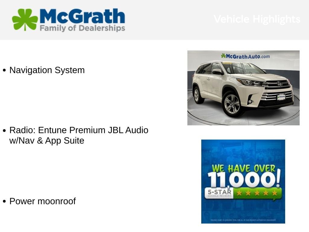 2017 Toyota Highlander Limited Certification Program Details: McGrath Smart Buy Benefits: * 3 Month / 3,000 Mile Limited Powertrain Warranty * Free Vehicle History Report * 106 Point Full Vehicle Condition Inspection